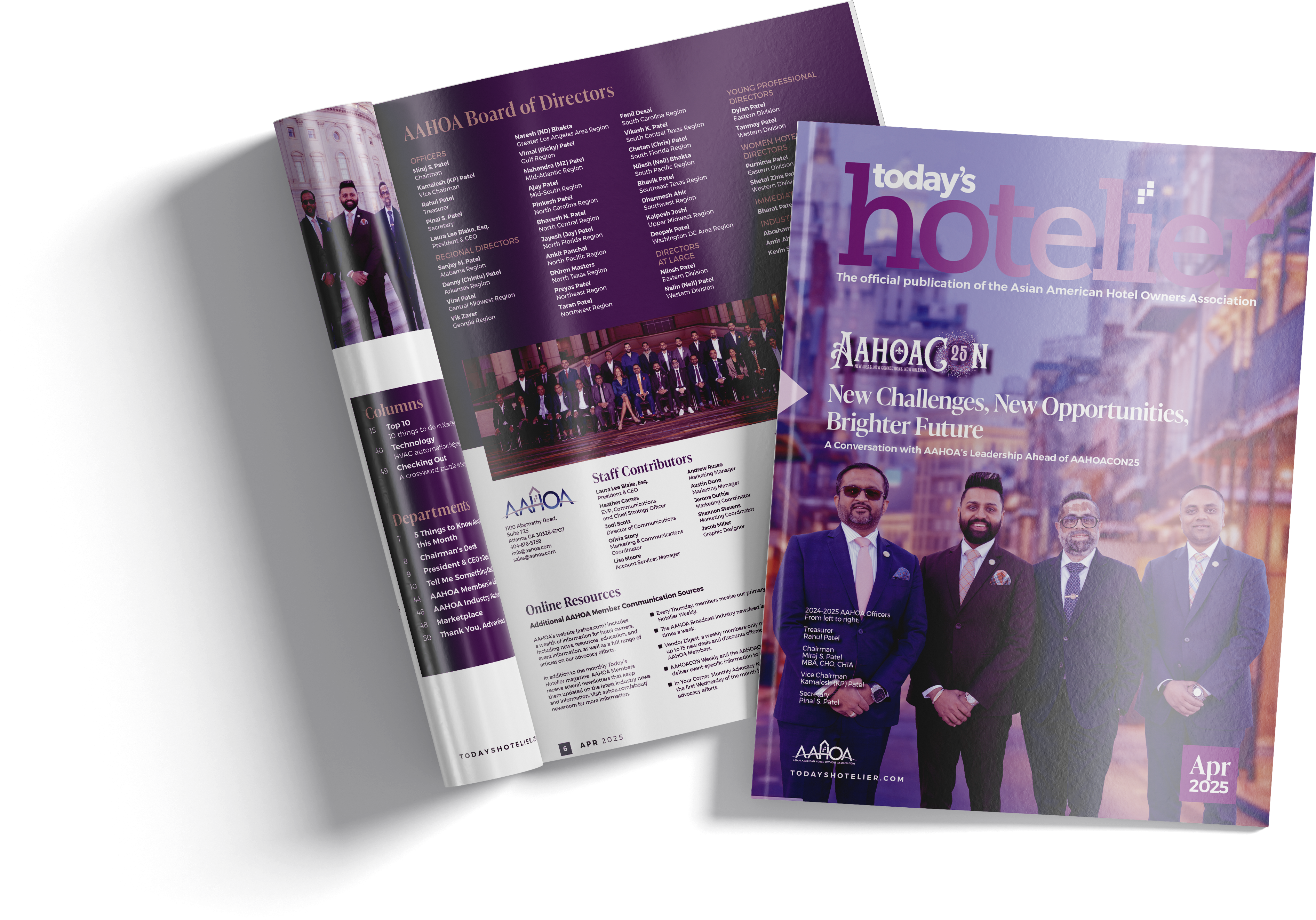 Today’s Hotelier is the award-winning official monthly magazine of AAHOA, America's leading organization representing hotel owners. This prominent industry publication provides hoteliers and industry leaders with in-depth dives into industry topics and trends, legislative issues and advocacy initiatives at the federal, state, and local levels, as well as the latest AAHOA happenings.