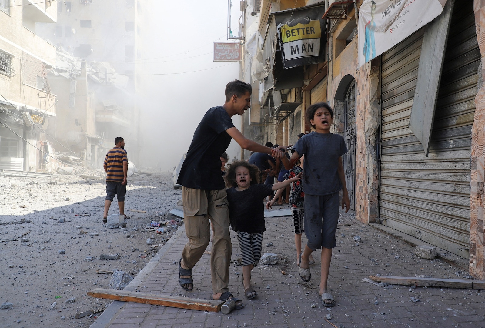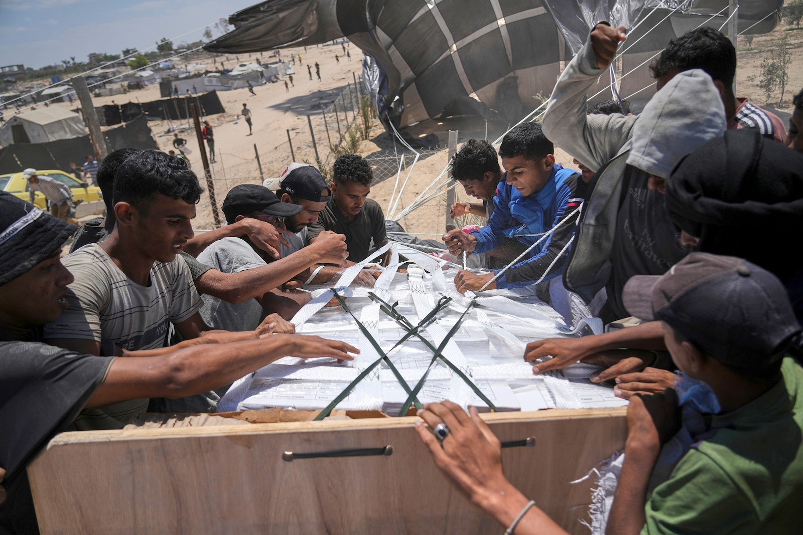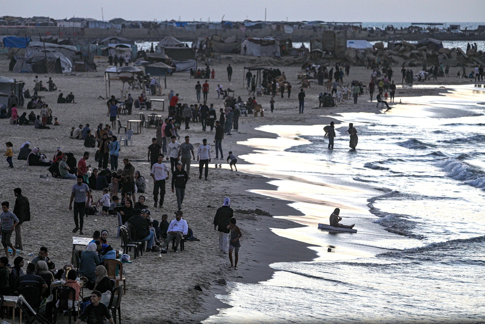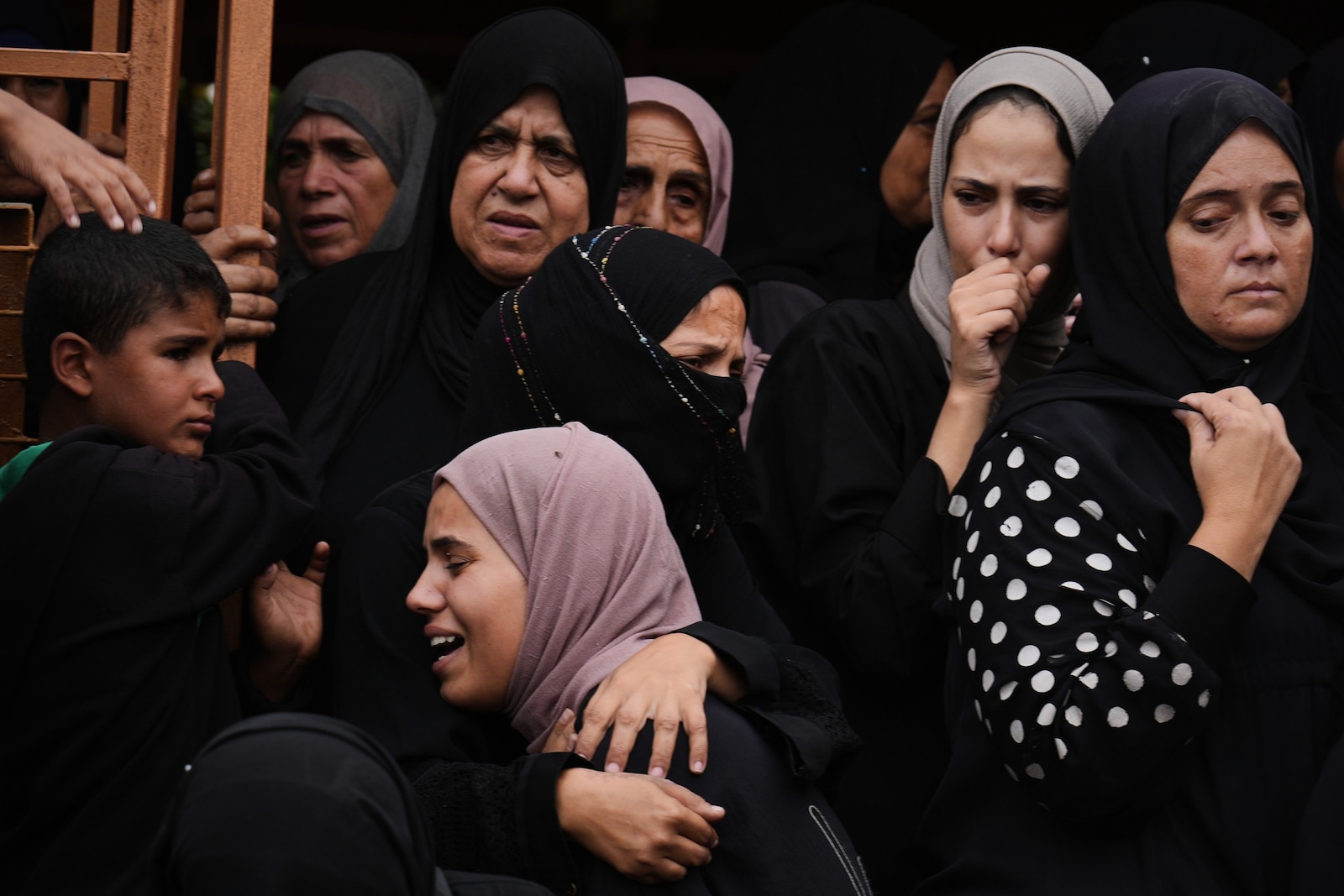 Displaced Palestinians, including children, hold metal pots and pans as they gather to receive food from a charity kitchen in Khan Yunis, southern Gaza Strip, October 31, 2025.