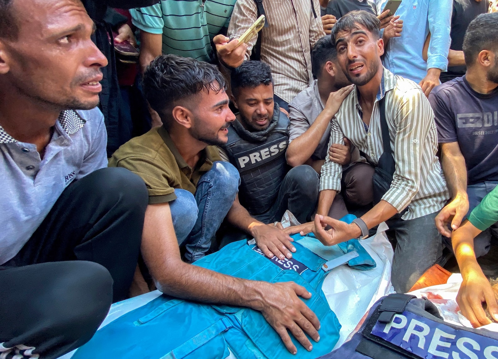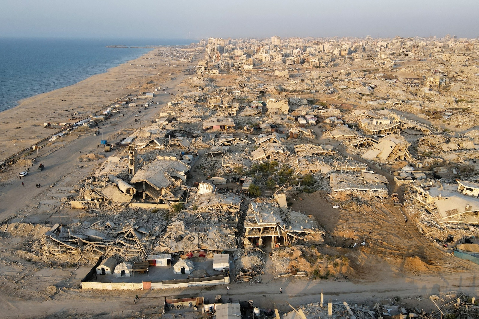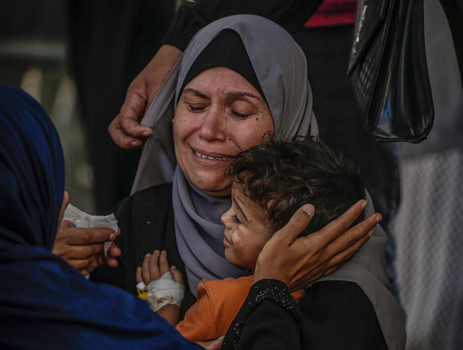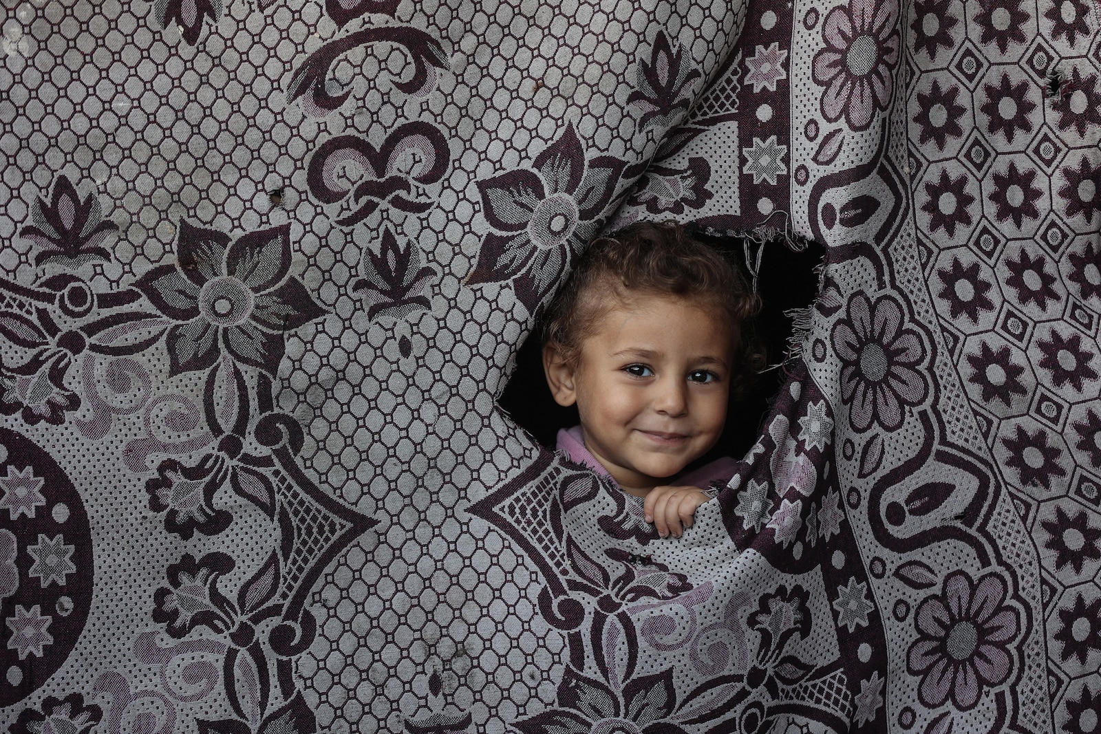 Displaced Palestinians, including children, hold metal pots and pans as they gather to receive food from a charity kitchen in Khan Yunis, southern Gaza Strip, October 31, 2025.