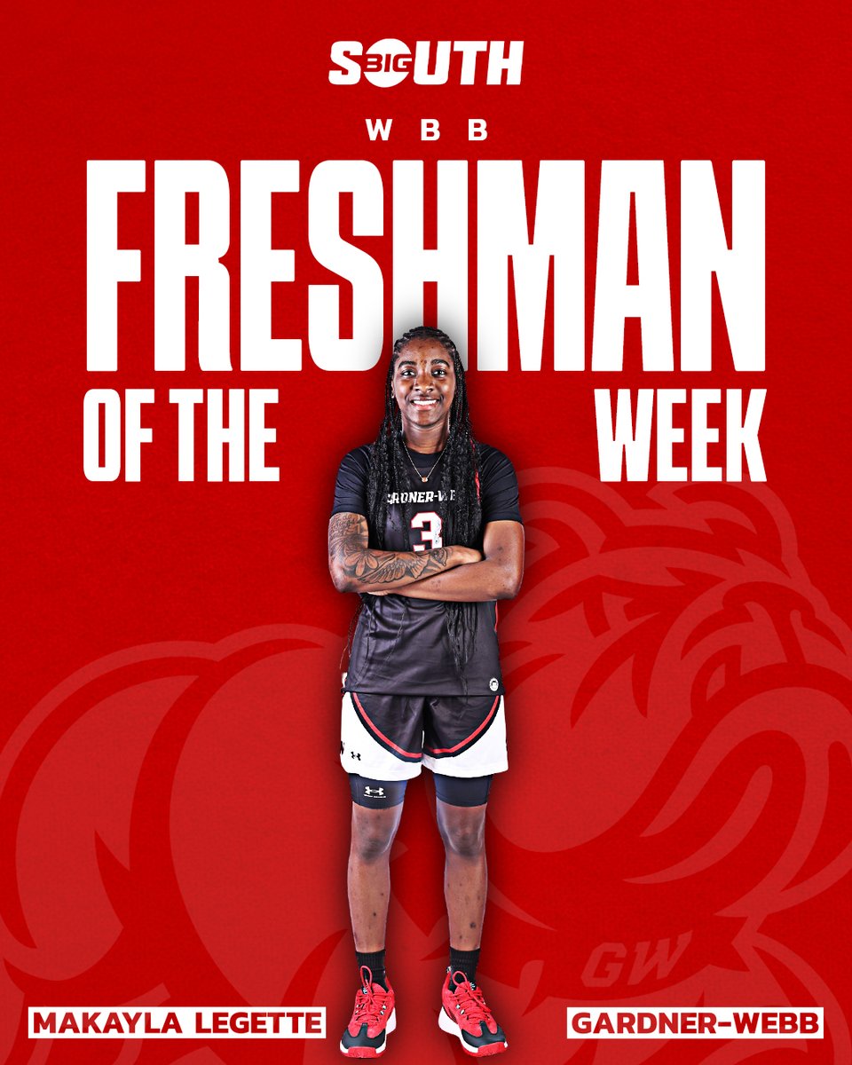 She averaged 11.0 points, 3.0 rebounds, 2.5 assists and 1.5 steals to help lead Gardner-Webb to a road win at CSU 🐶 @GWU_WBK's Makayla Legette is the #BigSouthWBB🏀 Freshman of the Week!