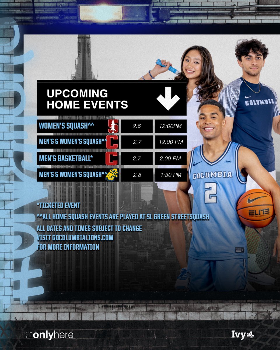 HOME EVENTS THIS WEEK‼️ 2-6 | Women’s @CULionsSquash vs Stanford | 12:00pm 2-7 | Men’s & Women’s Squash vs Cornell | 12:00pm 2-7 | @CULionsMBB vs Cornell | 2:00pm 2-8 | Men’s & Women’s Squash vs Trinity | 1:30pm #RoarLionRoar 🦁 // #OnlyHere 🗽