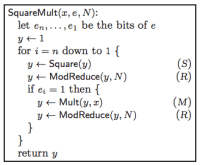 Now, Elgamal encryption is a great example for side-channel attacks, since it’s implemented by taking a portion of the ciphertext, which we’ll call x, and computing x^e mod N, where e is the secret key and N is (typically) a prime number. This exponentiation is implemented via the ‘square and multiply‘ algorithm, shown in the figure below: