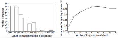 | Left: Fragment size vs. number of fragments recovered, Right: sequence accuracy as a function of fragments in a batch. (source: Zhang et al.) |
