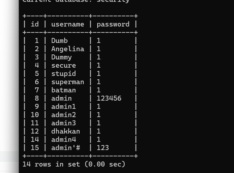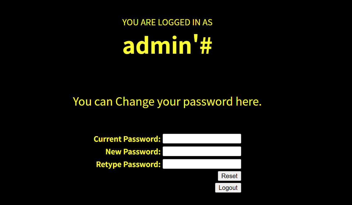 这是因为触发了二次注入,在进行修改密码时,admin'# 闭合了后面的条件,使得修改的密码为admin账号的。