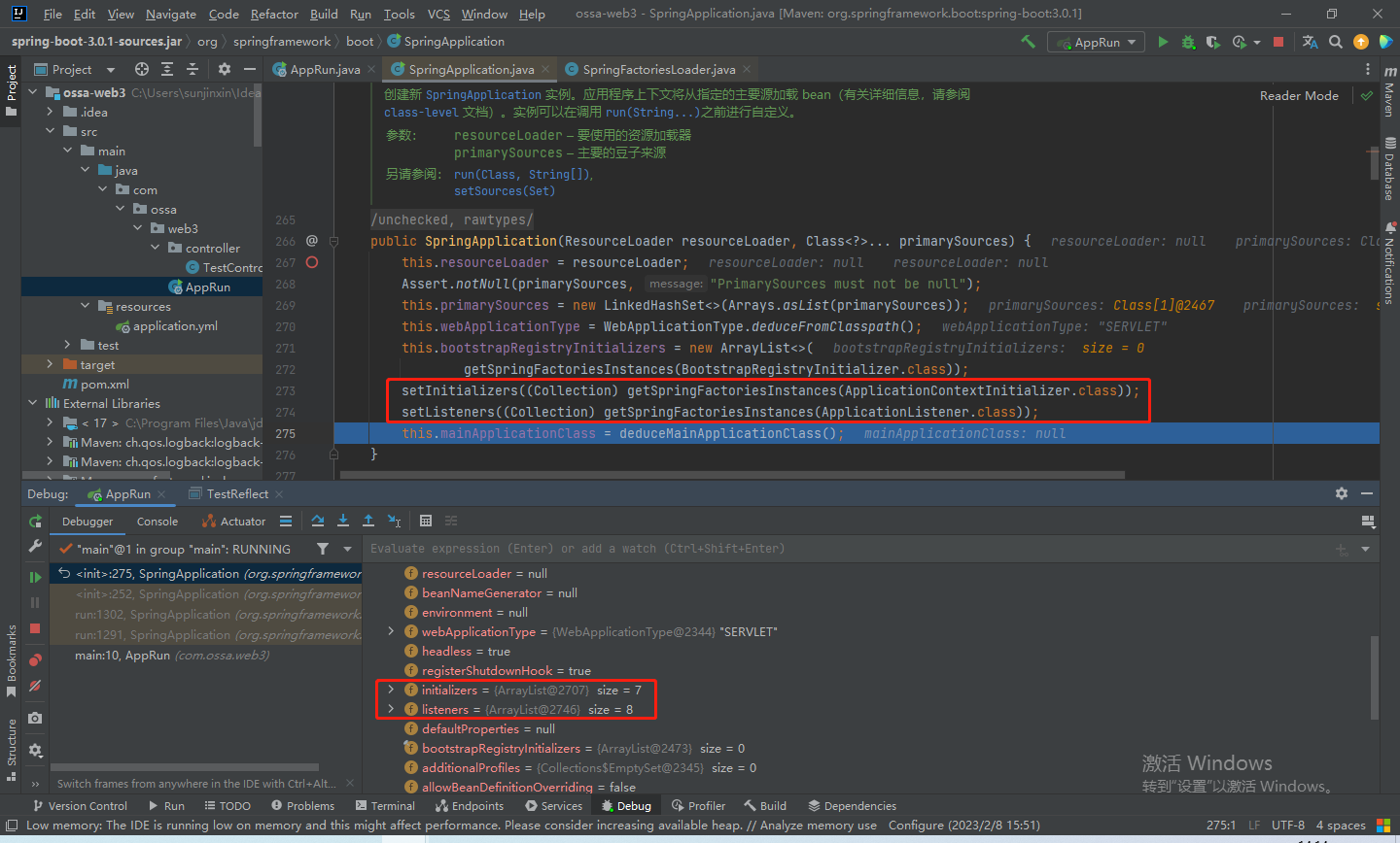 SpringBoot启动类:步入方法:这里分为两步:初始化步入SpringApplication的构造方法中:首先获取资源加载器、保存primarySources属性、web类型,设置初始化器和监听器,获取main方法所在的类重点看一下获取初始化器和监听器这部分。在此之前,看一下271行的代码:在SpringBoot的老版本中,是没有这快代码的,这里主要是提前加载一些初始化器、监听器和其他配置放入缓存中,以便后续获取。步入方法中:最终来到这里:这里首先构造一个加载器,再去调用load方法。步
