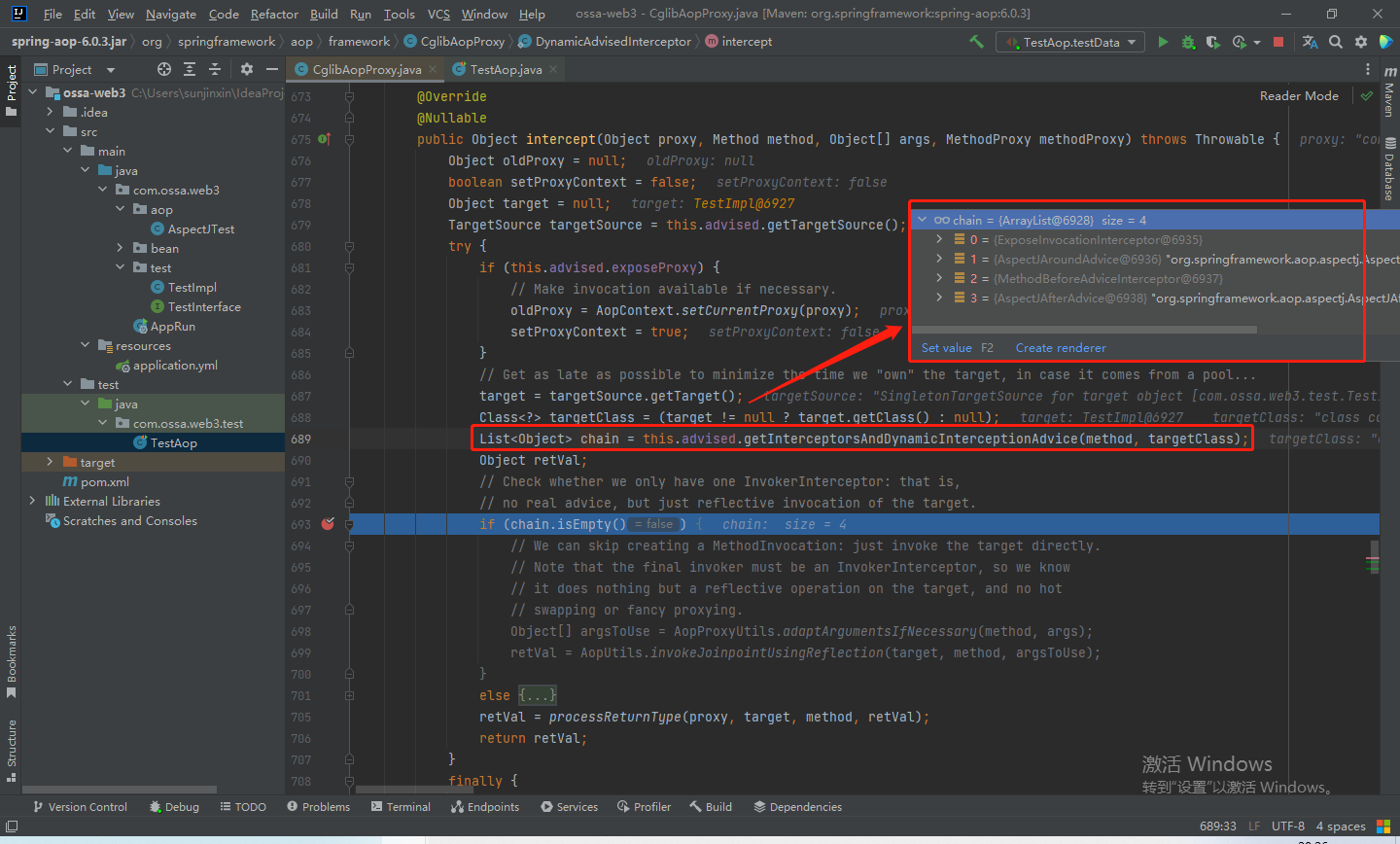 让我们看看是如何进行转换的,步入registry.getInterceptors方法,初始化拦截器集合,获取Advice【切面相关的配置】,对适配器进行循环,找到符合的拦截器,然后加入我们初始化好的拦截器List集合中,创建完代理对象之后,最终,会真正的执行我们的目标方法,但是步入该方法,会进入cglib代理类的拦截方法。调用after方法。不行了,我得去吃饭了,妈妈叫我吃饭了,呜呜呜,你们自己看看,挺简单的。好了,好了,累死了,好像有个问题没有写,就是三级缓存相关的,明天吧,专门给三级缓存写一篇。