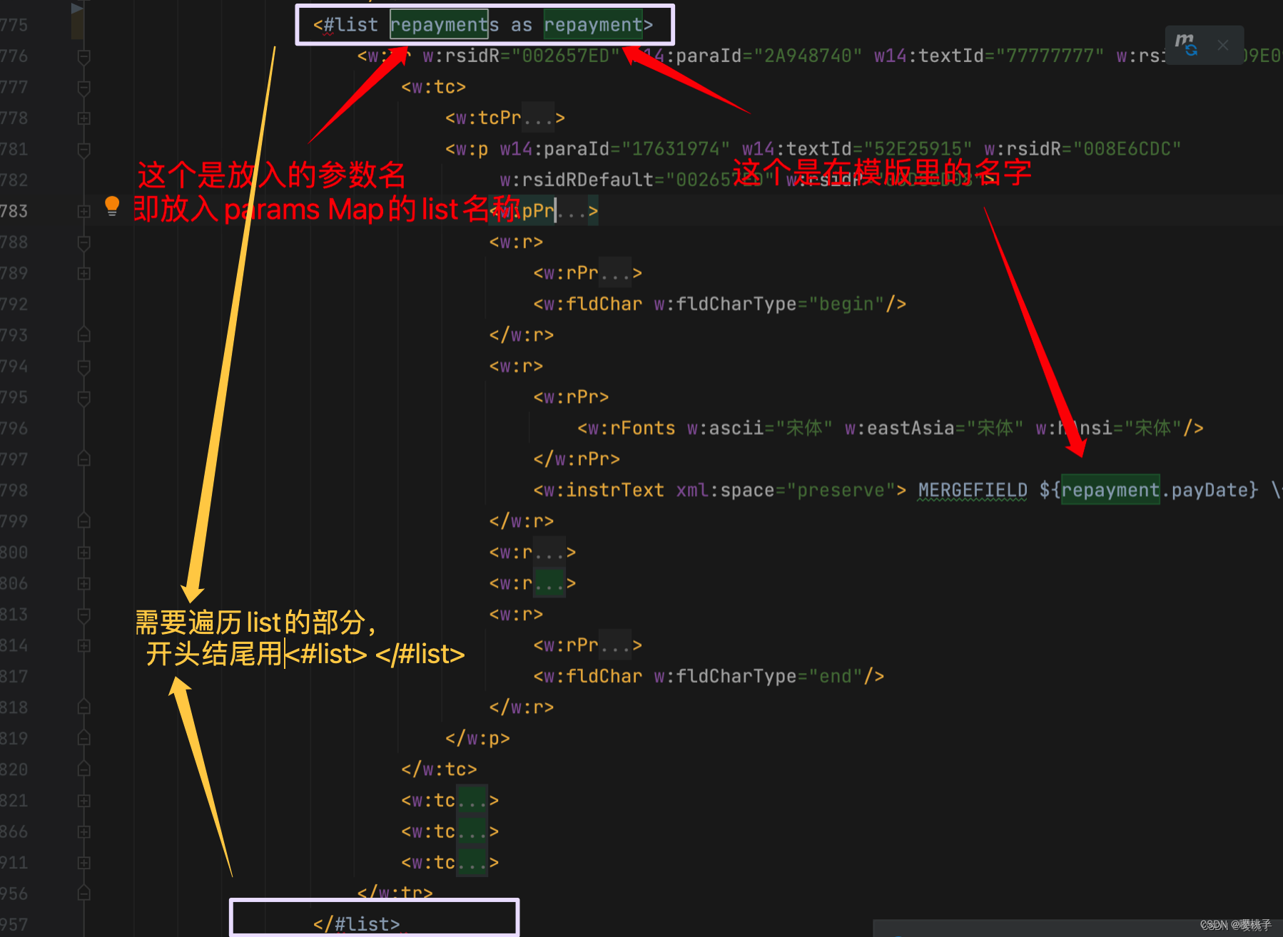 word for Mac下好多操作和win的不一样啊啊啊,差点栽在Mac word的模版设计上。win版本的word模版设计请参考文章:点此参考原文章开发语言:Java 8开发工具:idea第三方依赖:XDocReport、POI、Freemarker模版语言:Freemarker将需要动态写入的内容用word域框起来。word域(Mac版)插入方式如下:遍历列表输出,需要将域代码设置为,如,。接下来将所有内容替换为域代码将设置好的word模版导出为xml格式。注意,如果有list数据,需要在导出