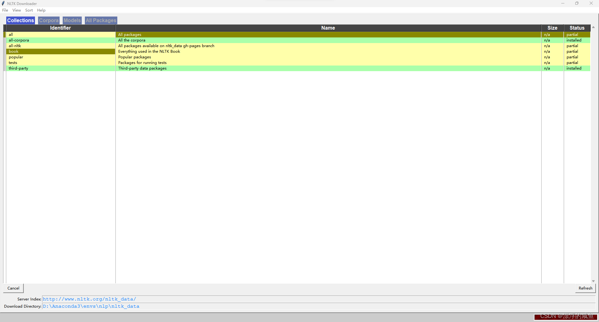 把压缩包解压到Anaconda3/envs/nlp/nltk_data目录下,没有nltk_data就新建一个文件夹。会得到nltk_data-gh-pages.zip文件。,然后路径改成前面新建的nltk_data文件夹。我电脑这样下载会报错,我后来在github下载的。后续使用有报错可以参考文章方法。遇到这个情况可以把网址改成这个。然后把压缩包解压到里面就行。然后就会像下图一样开始下载。
