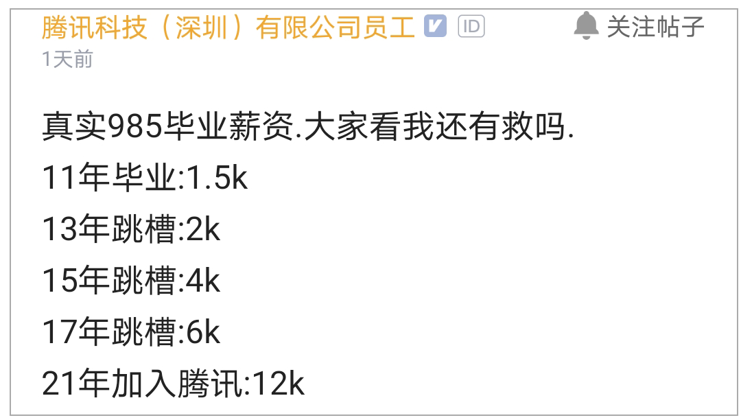 敢晒薪资的程序员大多都是还不错的,虽然互联网薪资比其他行业稍微高一些,但也存在普通薪资的情况。近日,有认证为腾讯员工的网友发帖称真实985毕业薪资,大家看我还有救吗?原贴如下这个帖子一经发出。引起了不少网友的“”。不少网友质疑的同时怀疑是日薪,单位写错了。但也有网友说自己也是这样。还有人调侃楼主的职业。楼主从11年到21年,已经工作了10年,薪资从1.5K到12K,在评论区有网友表示十年了,兄嘚,你这薪资确实有点太低了吧,我现在毕业第一年还没完,就顶你工作四年了?我咋这不信。...