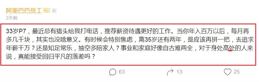 最近在某职场论坛上,有一位阿里程序员发帖吐槽:他自称目前33岁P7,最近总有猎头给我打电话,推荐薪资待遇更好的工作。当你年入百万以后,每月再多几千块,其实也没啥意义。有时候会特别焦虑,离35岁还有两年,是应该再拼一把,去追求年薪千万?还是知足常乐,抽空多陪家人?事业和家庭好像自古难两全,对于身处高处的人来说,真能接受回归平凡的落差吗?这样的吐槽也是瞬间引起了网友的围观与议论:同样,另一位35岁的阿里P7,年收入100万,已婚生子,有房有车,别人眼里的成功人士,自己知道事业要有下坡路了。同样感到焦虑