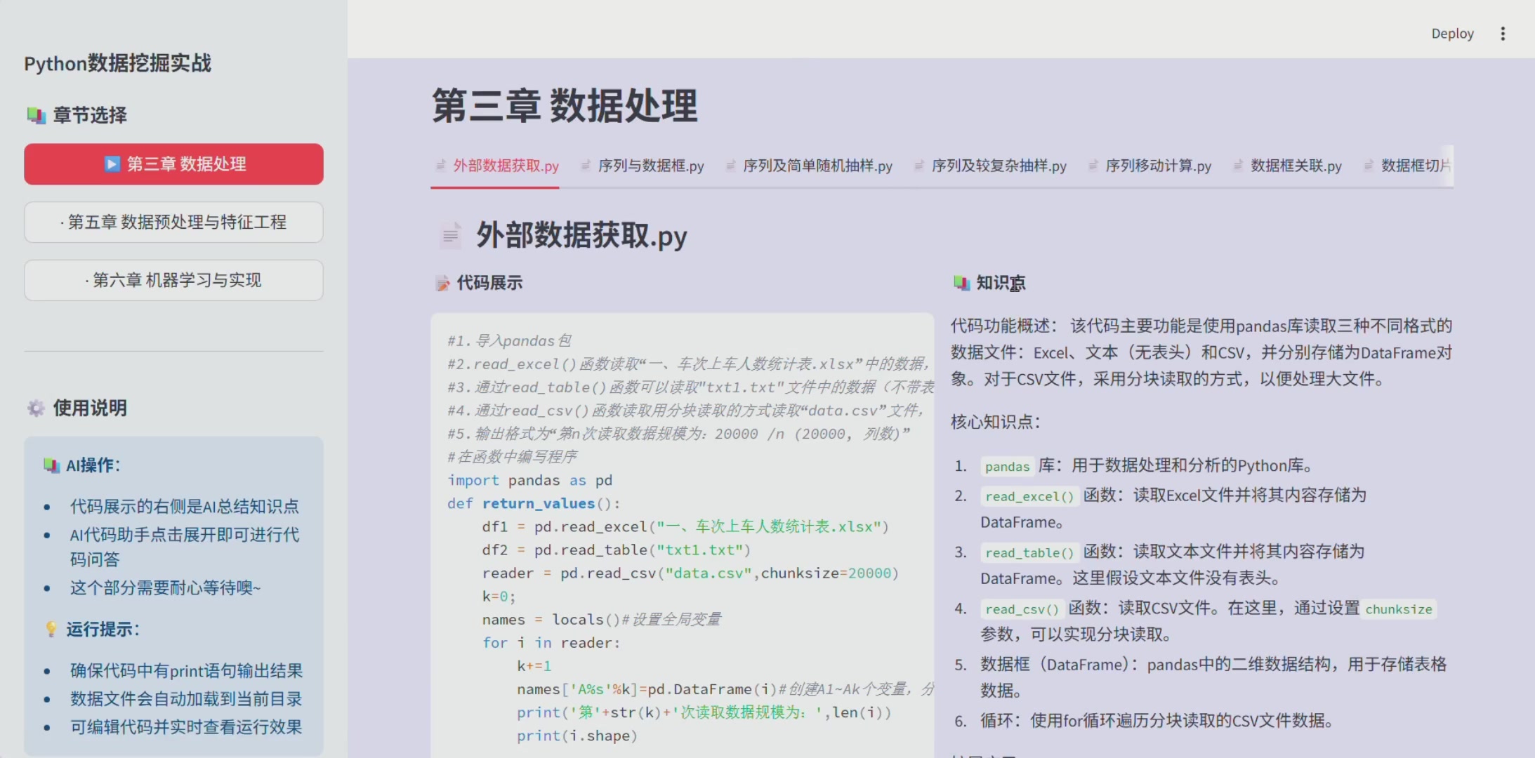 本文介绍了一个基于Streamlit和AI大模型的交互式Python数据挖掘学习平台。该平台通过自动解析Python代码生成结构化知识点,提供智能问答、实时代码编辑与运行、数据文件预览等功能,为初学者打造沉浸式学习体验。系统采用模块化设计,包含代码学习、AI辅助、文件管理等核心模块,并运用缓存机制优化性能。技术实现上,平台整合了Streamlit界面、大模型API调用、代码安全执行环境等技术栈,解决了响应延迟、状态管理、编码兼容性等开发难题。
