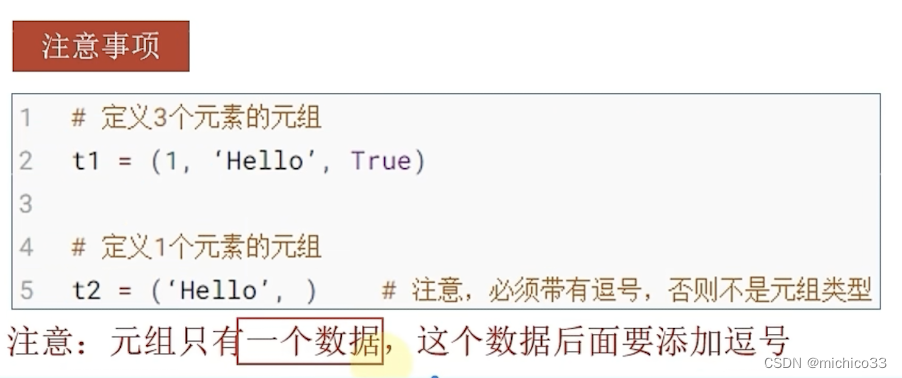 元组使用()定义,且使用隔开各个数据,数据可以是不同数据类型,同样支持嵌套,且支持下标索引,写法相同。注:元组只有一个数据,这个数据后面要添加逗号,否则不是元组类型。# 定义元组'''# 定义元组使用小括号,且使用逗号隔开各个数据,数据可以是不同的数据类型。# 定义元组字面量(元素,元素,元素,元素,,,,,)# 定义元组变量变量名称=(元素,元素,元素,元素,元素,,,,,)# 定义空元组变量名称=() #方式1。