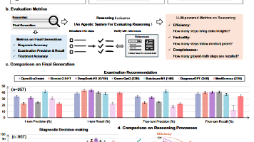 本文提出了一种系统性评估临床大模型推理能力的方法,通过构建包含1453例结构化病例的MedR-Bench评估集,将临床任务设计为检查推荐、诊断决策和治疗方案制定三个阶段。研究采用自动化的Reasoning Evaluator结合医生人工核查,从效率、事实正确性和完整性三个维度评估7个代表性推理大模型的表现。结果显示,当前模型在诊断环节表现优异,但在检查推荐和治疗规划方面仍有不足,推理完整性仅70-80%。研究特别关注罕见病场景,发现开源模型性能接近闭源系统,为临床AI的本地化部署提供了可能。该方法为构建科室