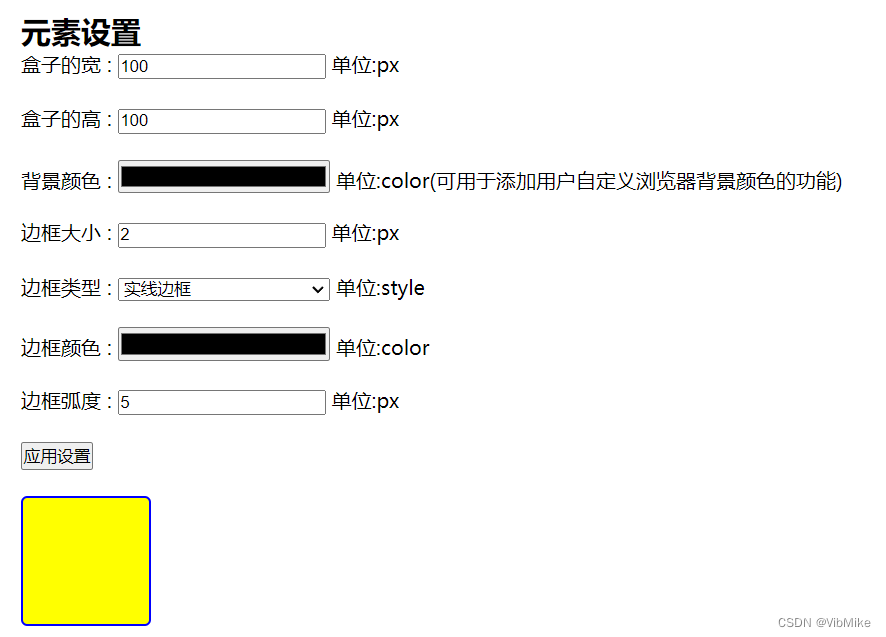 1、先创建一个容器用于存放按钮2、给这些按钮写一个标题3、添加按钮(更改元素宽、高、背景颜色、边框大小)4、给div设置样式,居中,看下效果5、 继续完善按钮(包括边框类型选择、边框颜色、边框弧度以及应用按钮)6、给不同等长度的按钮设置好长度,让其看起来更加美观7、写一个用于接受更改的div,并设置其样式8、获取各个选项框9、原理是获取选项框的内容来更改元素的style10、直接更改选项框和背景颜色即可更改div了;这.