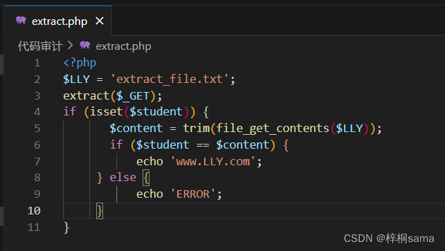 PHP extract() 函数从数组中把变量导⼊到当前的符号表中。对于数组中的每个元素,键名⽤于变量名,键值⽤于变量值。经过 extract() 函数后,会⾃动解析所有参数,并按照对应 key=value 的⽅式进⾏赋值,因此,当我们输⼊代码中预定义好的变量名时,变量的值会被覆盖。在上例中,将LLY参数进⾏重新赋值,由于找不到对应⽂件,所以 $content 变量为空,student变量不给他赋值,那么这时就可以满⾜其中的 if ($student == $content) 条件。