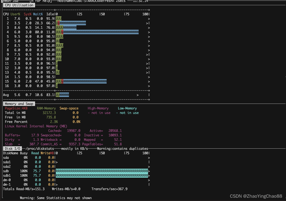 所以,对于DN来说,默认的Du,会产生大量的du -sk的操作,会造成集群严重的IO Wait增加,从而导致任务会变得缓慢。iostat -x 5: 磁盘IOutil 一直处于比较高的使用率,且iowait值比较大,io有一定的等待延迟;(将一个节点上同时产生的多个du操作,加个随机数,随机到集群的不同时间段,)不过也有一些临时的方案,比如说捕获到hdfs调用的 du -sk 命令,使用 df -k 进行替换。iotop排查有大量的du -sk 操作占用IO比较高,且执行很长时间;