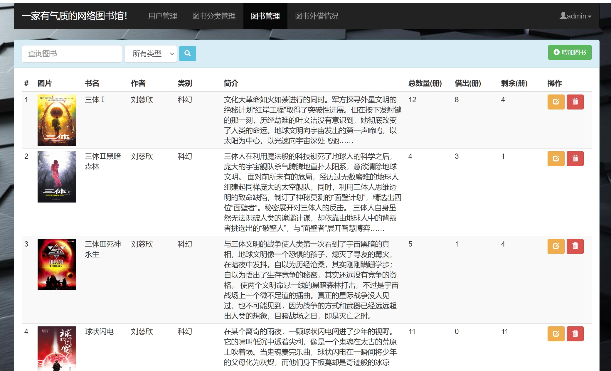 1、用户管理管理员可以新增、删除管理员管理员可以删除学生2、自习室管理管理员可以新增自习室、设置自习室的座位数量、开放时间,对自习室进行管理管理员可以管理学生的预订情况、可以强制退订3、学院班级管理管理员可以新增、修改、删除学院、班级(实际上这部分数据应该来源于教务系统)4、个人管理管理员可以对自己信息进行修改。