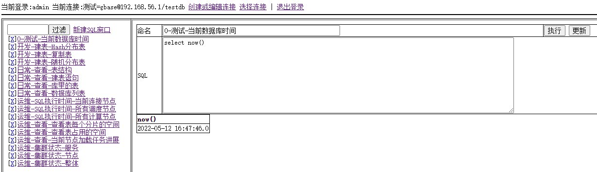 收拾起10年前的JAVA知识,用最古老的jsp编程,做出了针对GBase 8a的丑陋的WEB版本客户端工具。源代码为Eclipse项目,运行容器为Tomcat 8.5。不许嘲笑,我也是很厌烦每次都从笔记里复制粘贴SQL然后执行。公司产品自带的WEB工具太重量级了,所以自己写了个简单的。地址:GBase 8a 简单WEB客户端工具发布(包含源代码) – 老紫竹的家功能介绍2022-05-12增加删除连接的功能 增加删除已保存SQL的功能 支持SQL功能的过滤 支持SQL功能的更新(新