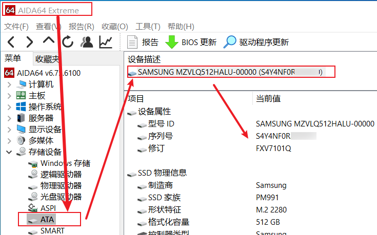 在AIDA64 -> 存储设备 -> ATA中查看详细信息。