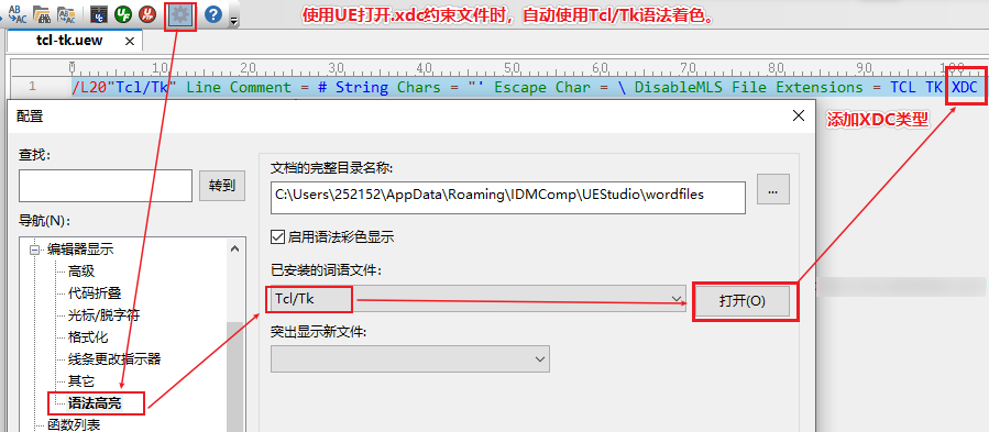 在UE中设置自动用Tcl/Tk语法着色XDC约束文件