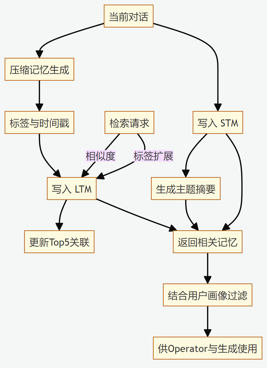2.LTM存压缩记忆(摘要向量+标签+时间戳+前5相关记忆),写入时回流更新关联,仿照人类巩固。