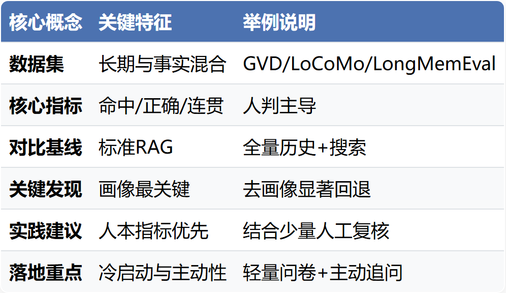 4.自动指标(ROUGE、BertScore)与人类目标弱相关,个性化评测应以检索命中、正确性、连贯性为主。