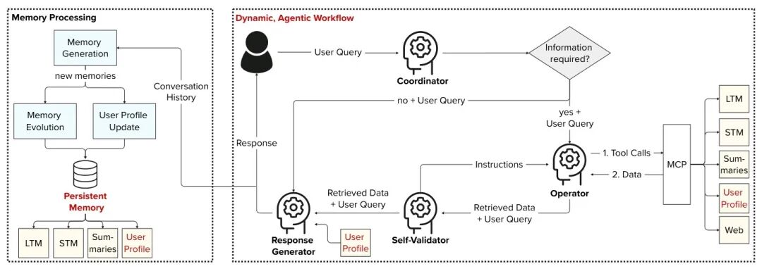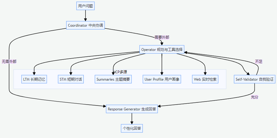 工作流:协调器分流请求;操作员以 RAG+MCP 访问 LTM/STM/会话摘要/用户画像/网页并择优组合;自验证器检查充分性与一致性并迭代改进;响应生成器结合用户画像输出个性化结果。