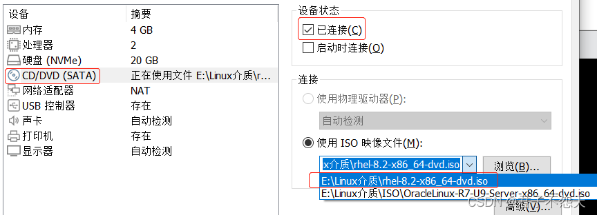 将ISO文件连接到虚拟机后在操作系统中对应的就是/dev/sr0设备。(默认对镜像文件写保护,以只读方式挂载)(默认对镜像文件写保护,以只读方式挂载)点击已连接(此处可以配置开机自动挂载)可以使用其他挂载点,但是规则文件中的。打开虚拟机设置 -->使用ISO镜像文件 -->比如上传传到/tmp目录。要与挂载点路径保持一致。(1).备份规则文件。(2).创建规则文件。