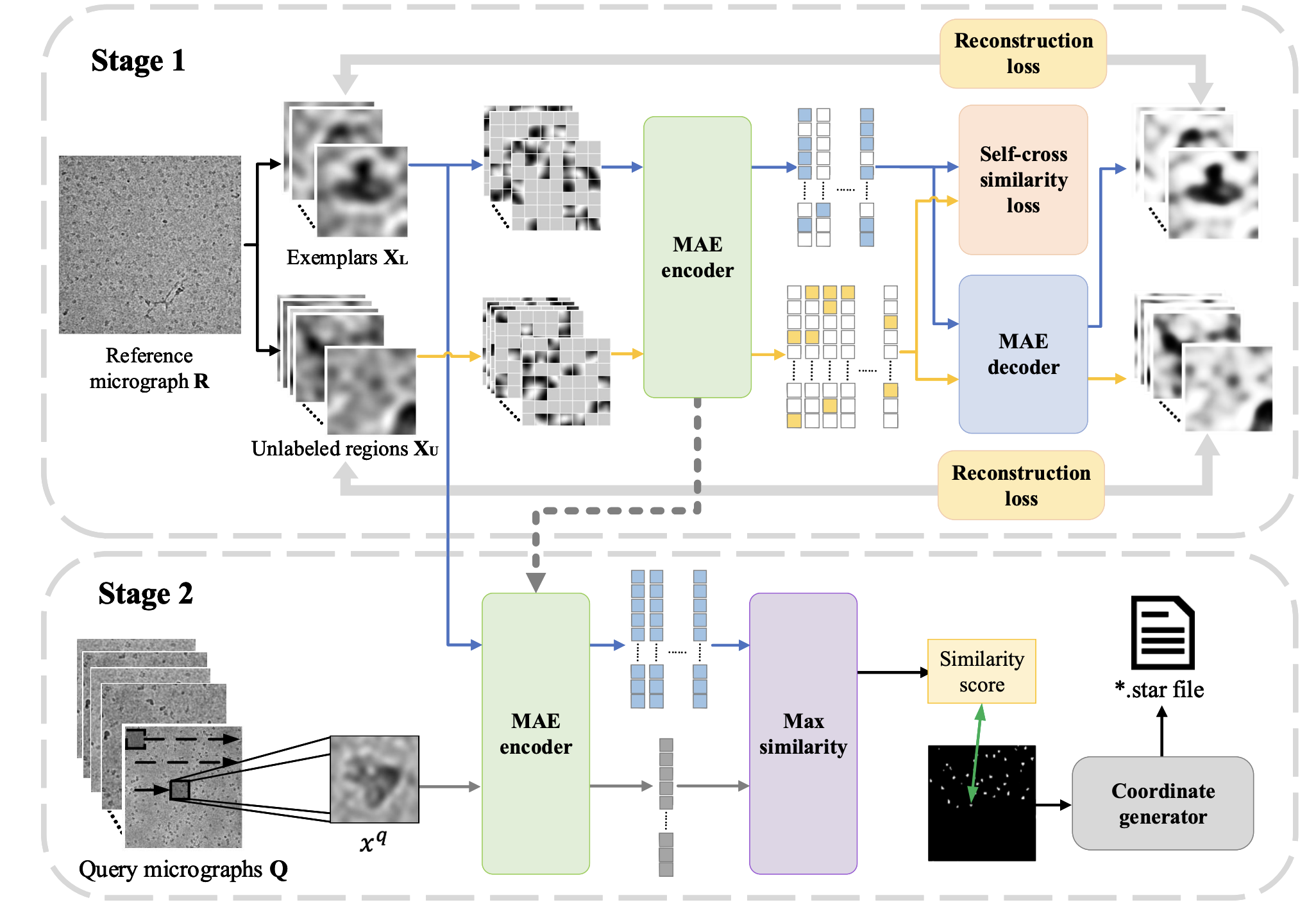传统的颗粒挑选面临着手动操作和自动化方法对低信噪比和不同颗粒方向的敏感性的困扰。现有的基于神经网络的方法通常需要大量标记数据集,限制了其实用性。为了克服这些挑战,本文提出了cryoMAE,一种基于少样本学习的新方法,利用掩蔽自动编码器(MAE)的功能来有效选择冷冻电子显微镜图像中的单个颗粒。cryoMAE只需要一组最少的正颗粒图像进行训练,但在颗粒检测方面表现出很高的性能。此外,自交叉相似性损失的实现确保了颗粒和背景区域的不同特征,从而增强了cryoMAE的鉴别能力。