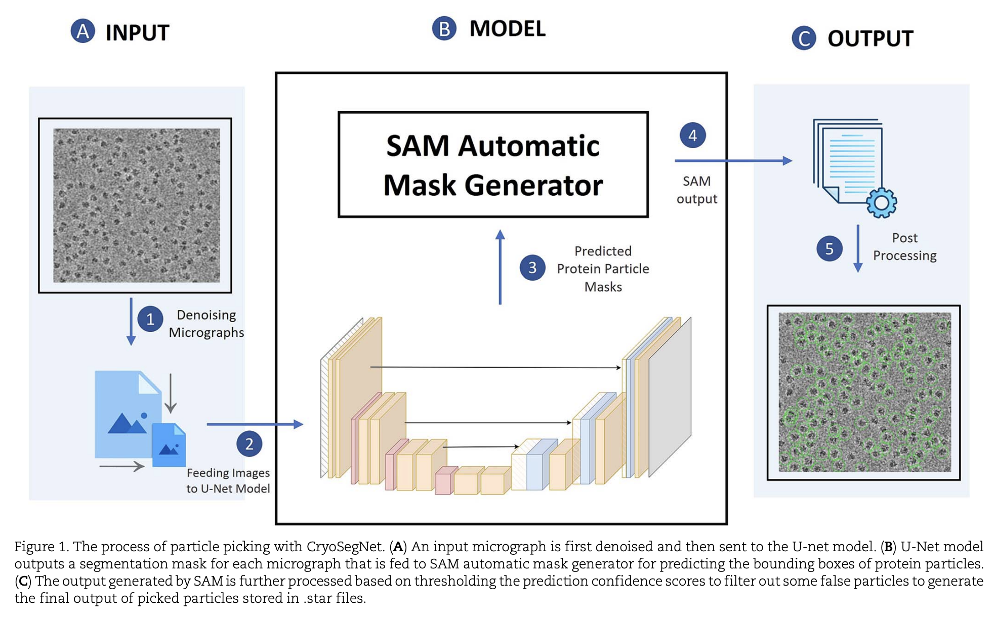 现有的基于有限数量的冷冻电镜数据训练的方法仍然无法从嘈杂的冷冻电镜图像中准确地挑选蛋白质颗粒。一般基于人工智能的基础图像分割模型,例如SAM( Segment Anything Model),无法很好地分割蛋白质颗粒,因为它们的训练数据不包括冷冻电镜图像。本文提出了CryoSegNet,集成了专门为cryoEM颗粒挑选设计和训练的注意力门控U型网络和SAM。U-Net 首先在大型cryoEM图像数据集上进行训练,然后用于从原始显微图像生成输入,以供SAM进行颗粒挑选。