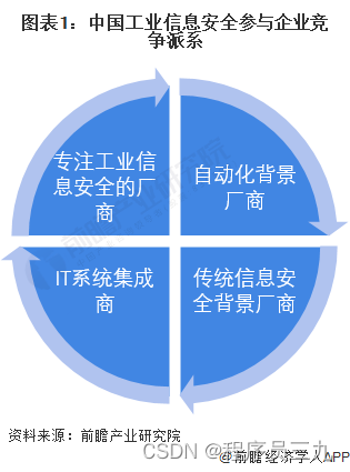 在国内涉及工业信息安全业务的企业中,根据业务发展背景可以分为自动化背景厂商、传统信息安全背景厂商、IT系统集成商以及专注工业信息安全的厂商四大类。