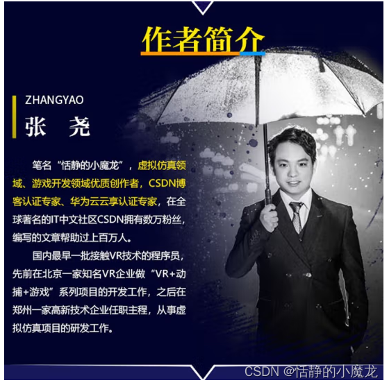 个人简介:CSDN博客专家、Unity3D领域优质创作者,专注于VR、虚拟仿真开发。 《Unity 3D从入门到实战》作者。