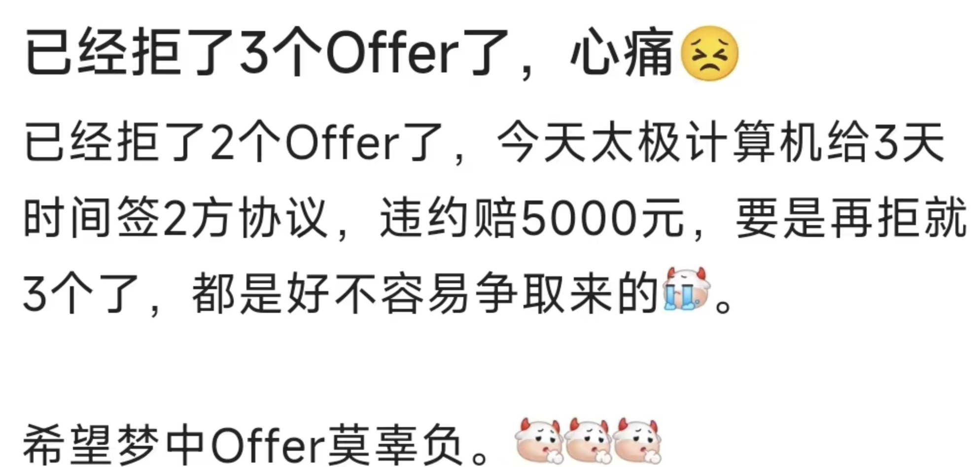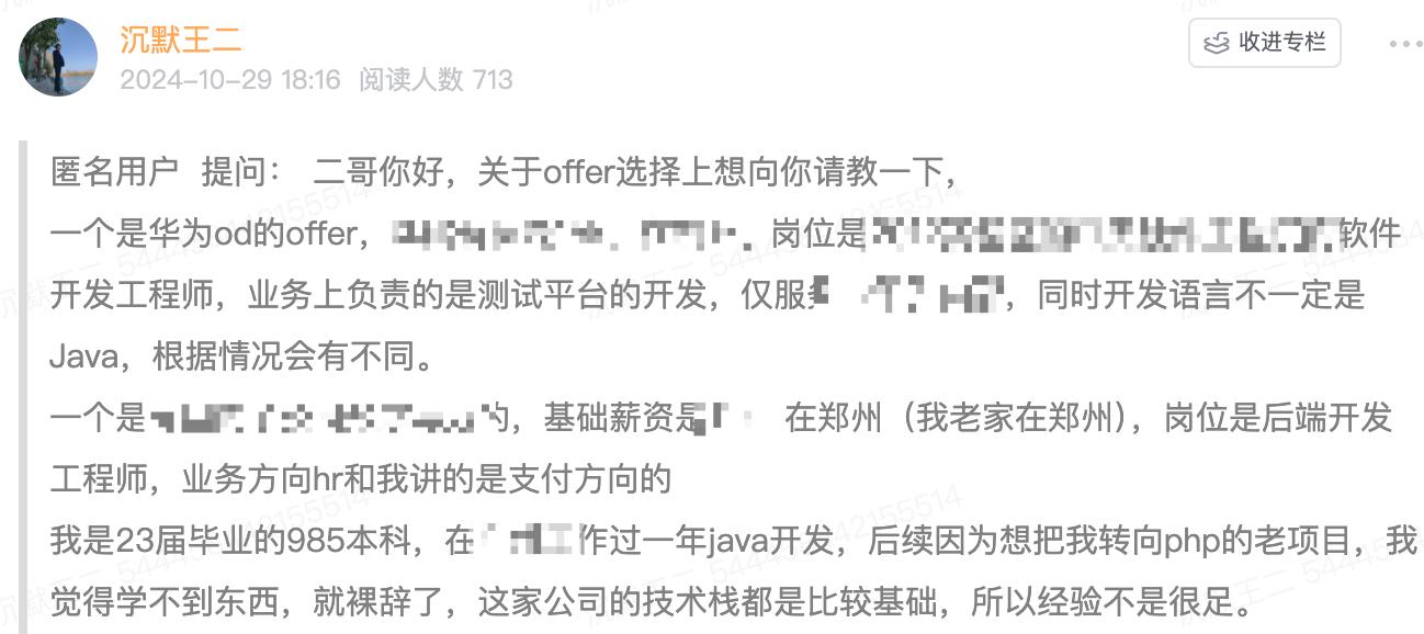 有 gap 期的话,找工作是比较被动的,哪怕教育背景很不错,比如 985 本。星球里就有这样一位 23 届的球友,985 本,在 xx 工作过一年,做的是 Java 开发,因为公司想让他转 PHP 开发,就索性裸辞了。24 年10 月份拿到了两份 offer,一个是华为 od,另外一个暂时先保密,薪资待遇比华为 OD 这个低一些。可能很多小伙伴看到这里会觉得 985 本去华为 OD 太亏了吧?