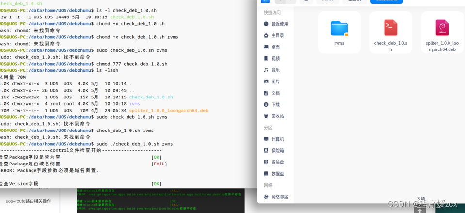 安装在统信电脑 处理器:Loongson-3A60000-HV @2.5GHz 可以使用,现在要求是应用性能自动化测试工具测试通过,现在我不知道是哪项没通过 ,在官网上先通过脚本来测试一下。我在解决错误时脚本提示我不能写 loongarch64 架构,但是只有这个架构软件能用,其他安装时报错软件包架构不匹配,先写的loongarch64 脚本没通过,后期测试工具也通过了。把我之前在麒麟龙芯电脑上打包的 deb 包,根据文档来测试。1、解压需要被检查的deb包。打包完测试一下,还是没通过。