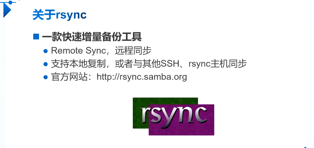 是一个开源的快速备份工具,可以在不同主机之间镜像同步整个目录树,支持增量备份,并保持链接和权限,且采用优化的同步算法,传输前执行压缩,因此非常适用于异地备份、镜像服务器等应用。第一次同步时 rsync 会复制全部内容,但在下一次只传输修改过的文件。rsync 在传输数据的过程中可以实行压缩及解压缩操作,因此可以使用更少的带宽。在远程同步任务中,负责发起rsync同步操作的客户机称为发起端,而负责响应来自客户机的rsync同步操作的服务器称为同步源。