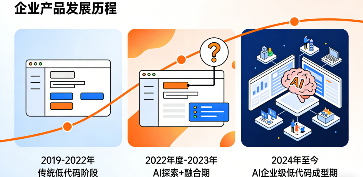 - 它从低代码向AI企业级低代码转型的过程中,又经历了哪些关键节点?