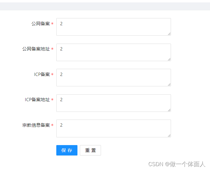 前端向后端传送的是一个对象数组,也就是这种格式:[{label: ‘xxx’, value: ‘xxx’}]后端用Go实现,因为每次新增的信息可能不一样,所以每次新增的时候,会先删除旧的数据,再插入。在做项目的时候,甲方给的信息有限,网页的备案信息写成固定的,如下图所示。
