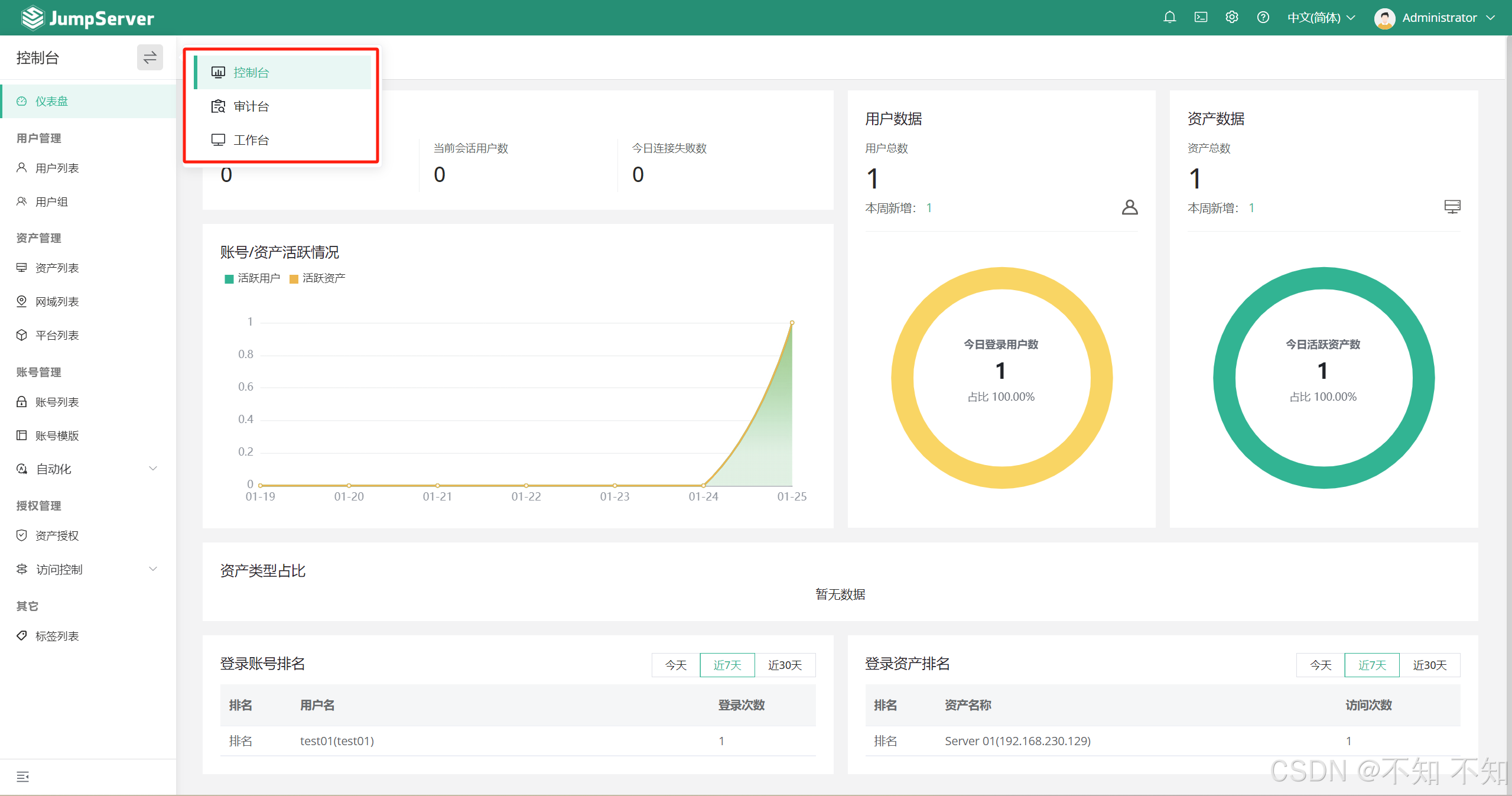 使用管理员账号登录JumpServer 堡垒机 Web 面板之后,我们会发现该账户可以进行三端切换(控制台、审计台和工作台),其中用户管理、资产管理及授权管理都在控制台里。这篇文章主要记录如何在JumpServer 堡垒机中进行资产管理。最新-CentOS 7 基于1 Panel面板安装 JumpServer 堡垒机我这里使用VMware创建了一台JumpServer 堡垒机(1v)和三台服务器(分别是Server01、Server02和Server03),系统为CentOS 7。名称IP地址。