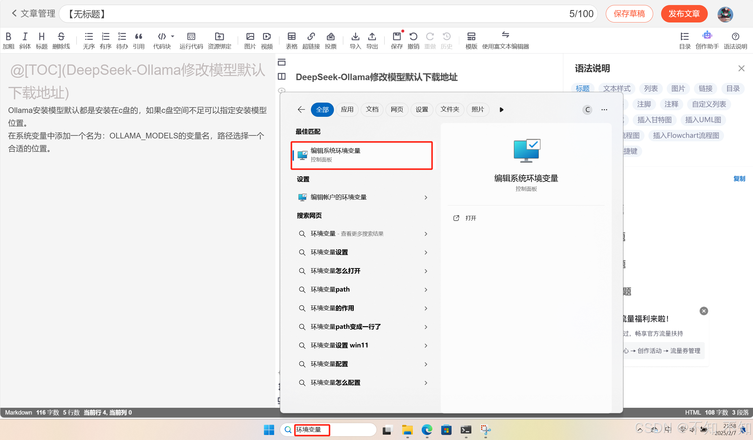 4.在系统变量中添加一个名为:OLLAMA_MODELS的变量名,路径选择一个合适的位置。Ollama安装模型默认都是安装在c盘的,如果c盘空间不足可以指定安装模型位置。5.Alt+Ctrl+Delete进入任务管理器,找到Ollama,结束任务。1.Windows搜索框中输入“环境变量”,选择编辑系统环境变量。6.在开始菜单中双击Ollama,重新启动,配置生效。2.在弹出的系统属性窗口中,点击环境变量。