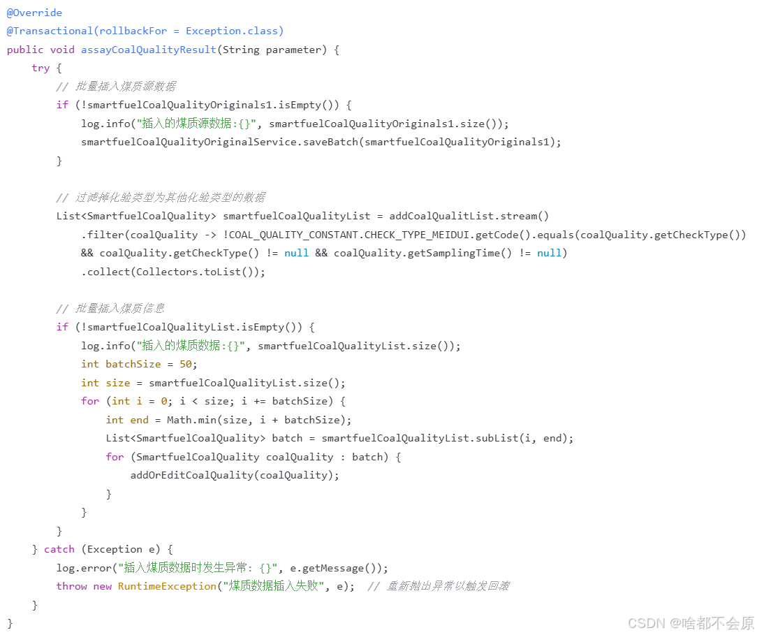 指定异常类型,加了之后发现还不行,捕获了异常catch里面没有抛出,实际应该如下面的解决方案1,也可以不用捕获,直接。指定需要回滚的类型异常类型,如下解决方案2。也正常插入了数据,并没有回滚。导致事务没有控制住,该方法发生了错误后,