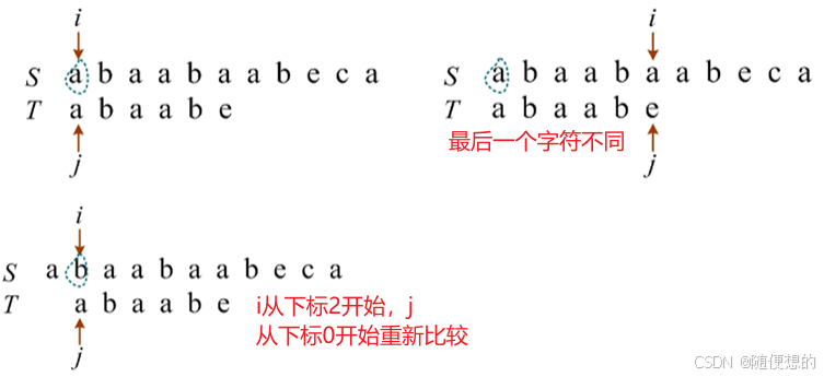 KMP算法——著名的模式匹配算法。KMP算法的特点是i不回退,如果S[i]=T[j]时,则i++,j++,继续比较;如果S[i]≠T[j],j回退到next[j],重新开始比较。算法关键是计算next[]数组。此例从图中观察可看出T的前两个字符无需比较,那么一般情况怎么确定T的前几个字符不需要比较了呢?i指向字符的前两个字符和T串中j指向字符的前两个字符一样,不一样就不会i++,j++比较当前位置元素了。那么T的前几个字符无需比较可以根据T串确定。继续探究不需要比较几个字符。