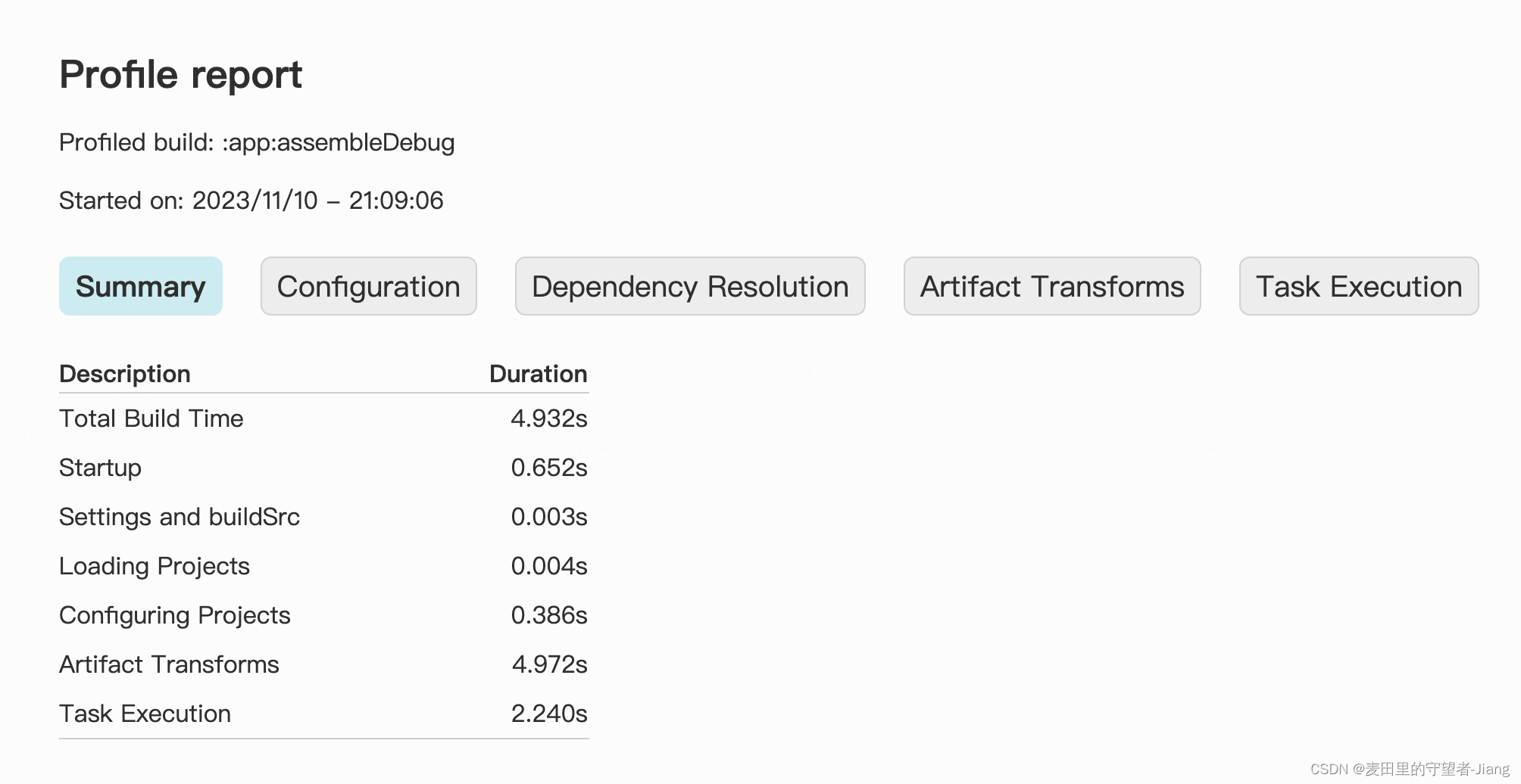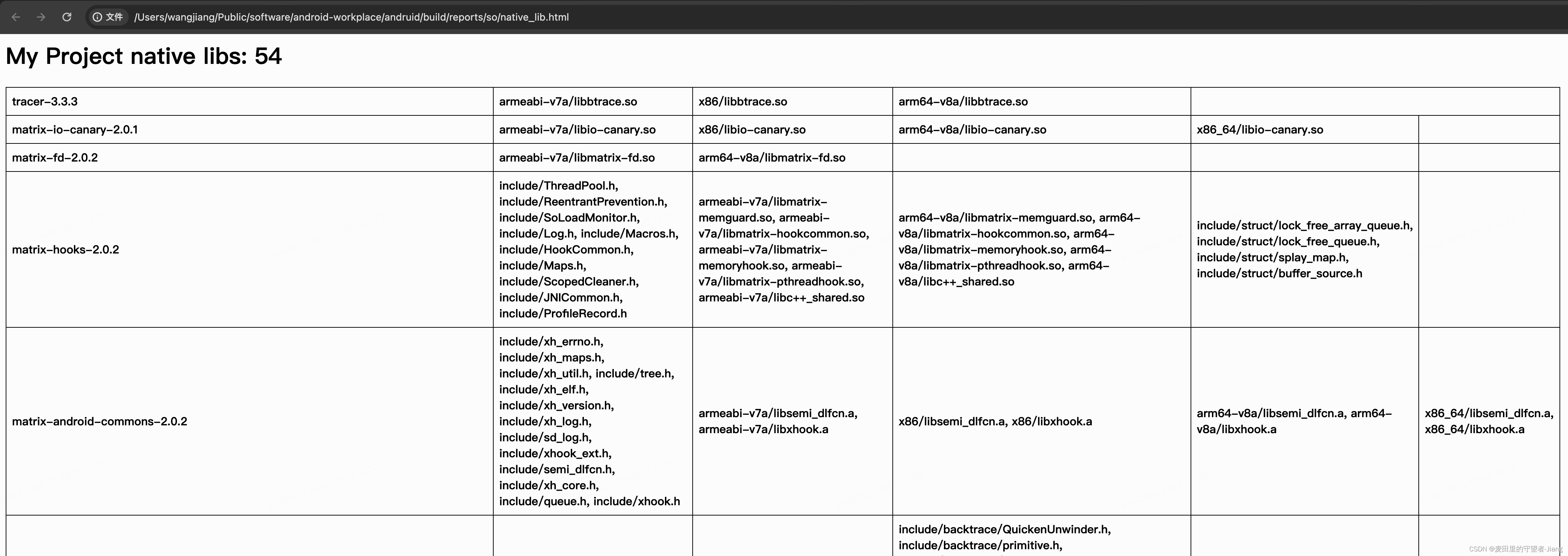 不管是接触一个新项目,还是一直开发老项目,使用 Gradle 命令,可以对项目构建信息有一个快速的掌握。要分析项目 aar 或 jar 依赖信息,可以使用 Task :app:dependencies或./gradlew :app:dependencyInsight --configuration someConf --dependency someDep ;要分析项目 so 依赖信息,可以监听 Task :app:mergeDebugNativeLibs。依赖信息对于解决依赖冲突,库升级问题非常有帮助。另