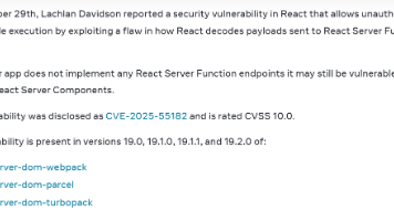 摘要:React框架及其相关组件(包括Next.js等)曝出高危漏洞CVE-2025-55182,CVSS评分为满分10.0。该漏洞允许未经认证的攻击者通过恶意HTTP请求实现远程代码执行,影响React Server Components的多个版本。约39%的云环境可能受影响,修复补丁已发布(19.0.1/19.1.2/19.2.1)。专家警告该漏洞极易被利用,建议立即升级。临时缓解措施包括限制/server-function端点访问和监控可疑请求。漏洞由安全研究员11月29日报告,12月3日公开披露。