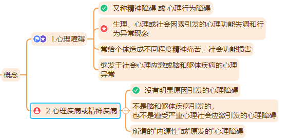 1.心理障碍 :指个体因各种生理、心理或社会因素引发的心理功能失调和行为异常现象。常给个体造成不同程度的精 神痛苦、社会功能损害。 即任何因素导致个体的心理行为显著偏离常态,出现精神 痛苦或不能适应社会生活的异常状态,又称精神障碍或心理行为障碍。继发于社会心理应激或脑和躯体疾病的心理 异常称为心理障碍。