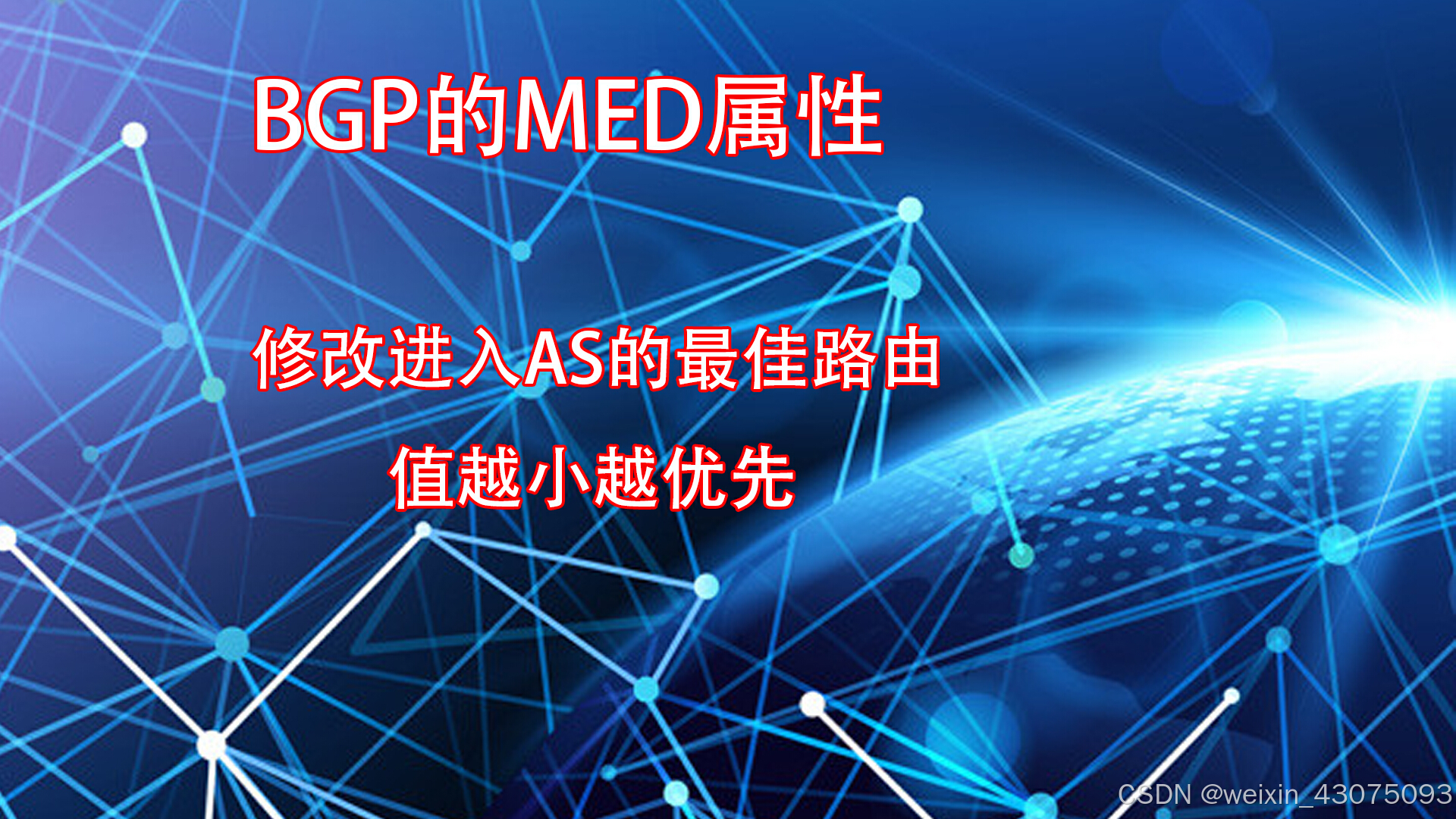 MED属性(Multi-Exit Discriminator)在BGP(Border Gateway Protocol)中用于控制路由选择,其值越小,优先级越高。MED属性仅在相邻的两个AS(自治系统)之间传递,收到此属性的AS一方不会再将其通告给任何其他第三方AS。BGP默认没有度量值,没有cost;所谓的 MED 就是人为的在路由条目中编写一个cost数值,干涉选路;可用于干涉 EBGP/IBGP 关系下的选路;最常用于干涉 EBGP 关系选路;MED属性相当于IGP使用的度量值(Metric)。