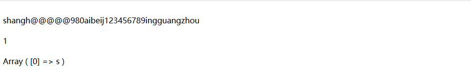 preg_match()我们先来分析一下这个函数。$res=preg_match($preg,$str,$out);首先这个函数的作用就是匹配str字符串中的符合preg的字符。然后存储到out变量中。我们在一般的代码开发中都是取这个函数的值。也就是res。那么这个值到底返回什么呢?我们在代码中实现一下:$str="shangh@@@@@980aibeij123456789inggua...