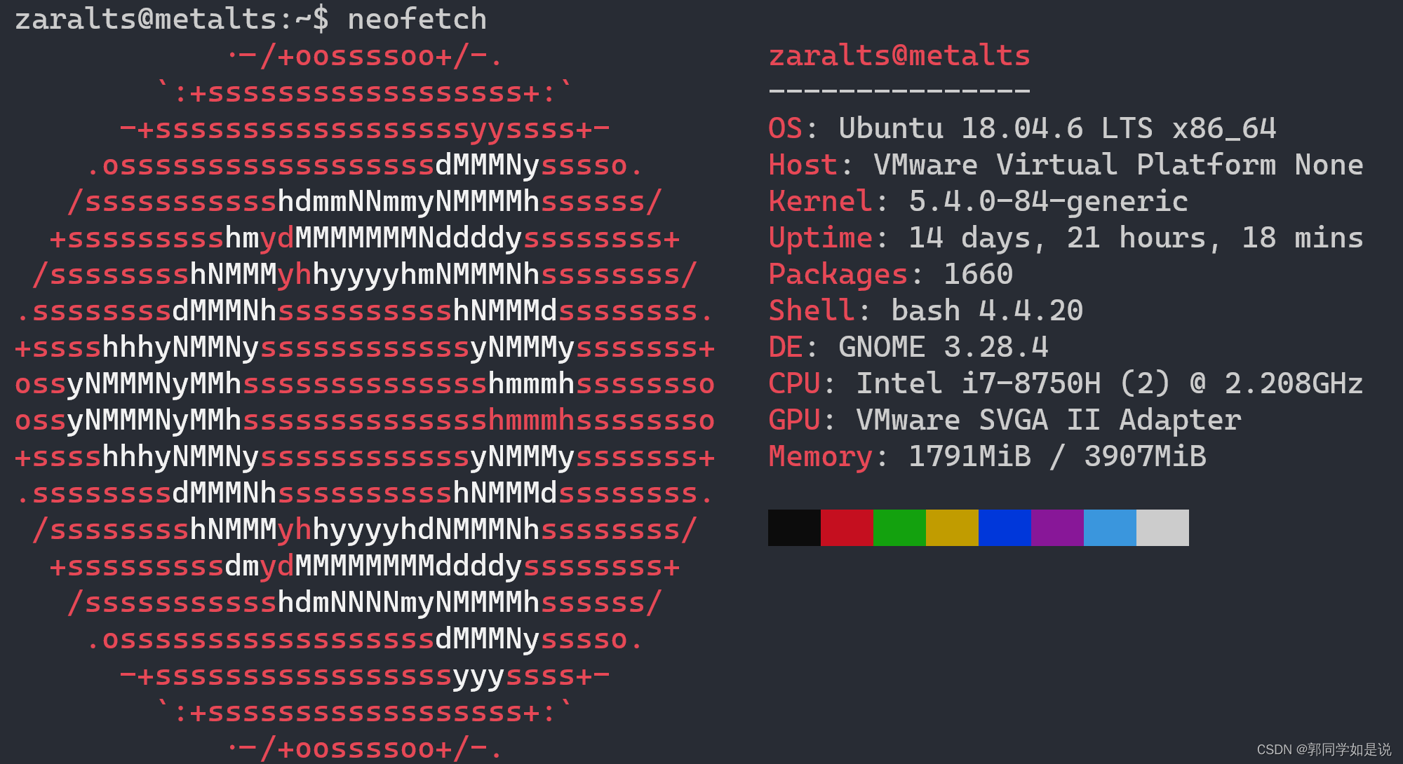 uname命令$ uname -aLinux metalts 5.4.0-84-generic #94~18.04.1-Ubuntu SMP Thu Aug 26 23:17:46 UTC 2021 x86_64 x86_64 x86_64 GNU/Linuxlsb_release$ lsb_release -aNo LSB modules are available.Distributor ID: UbuntuDescription: Ubuntu 18.04.6 LTSRelea