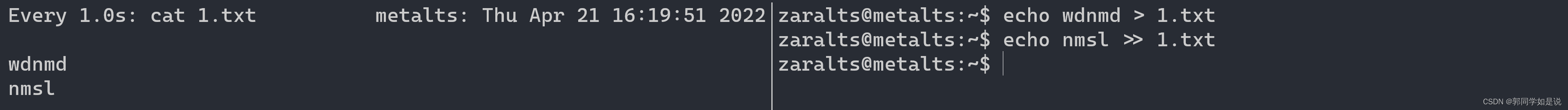 watch命令简介watch命令可以重复的执行命令,并且将其输出在命令行上,可以方便的实现一些简单的监控 watch -n 1 cat 1.txt上面的这个命令输出1.txt的内容,-n 1表示每隔一秒钟执行一次命令右侧shell执行命令,左侧是watch的输出我们可以看到先是输出了wdnmd,然后输出了nmsl,至此,我们很简单的实现了一个不断变化的文件的监控,但它是实用的——比如监控一个动态变化的log日志另一个小例子:在所有进程中查找是否有node关键字的进程,每隔三秒刷新一次 wa