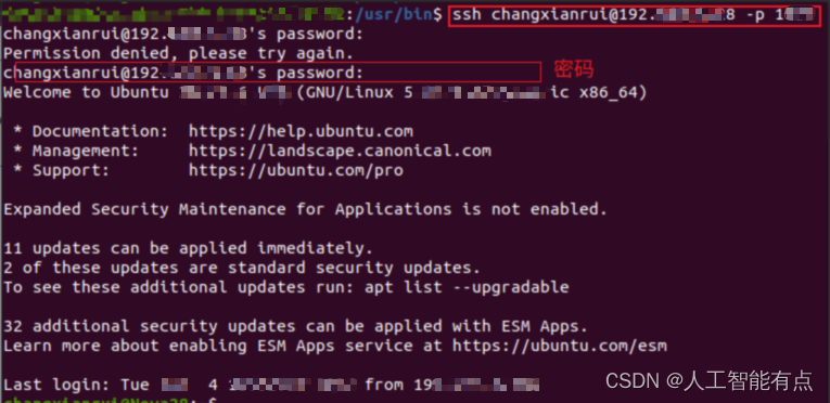 命令格式:ssh 用户名@主机IP。然后输入密码,就可以登录进去了。